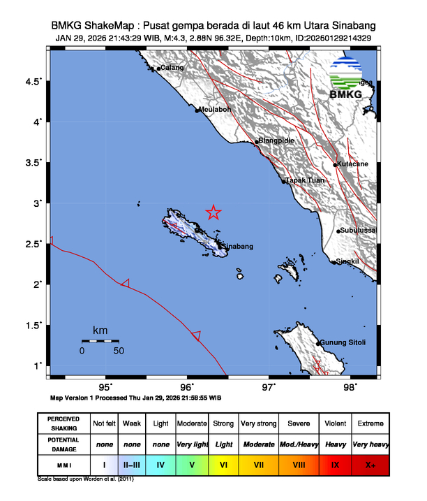Pusat gempa berada di laut 46 km Utara Sinabang
