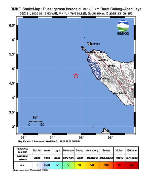 Pusat gempa berada di laut 86 km Barat Calang-Aceh Jaya