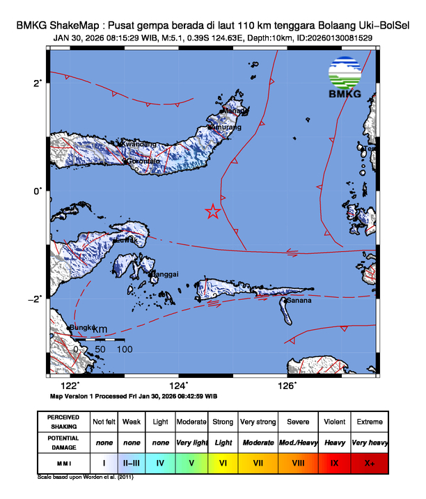 Pusat gempa berada di laut 110 km tenggara Bolaang Uki-BolSel