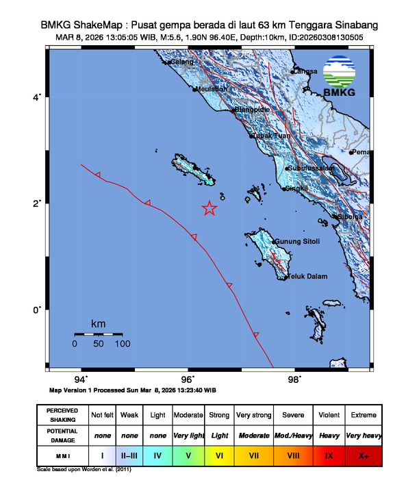 - Pusat gempa berada di laut 63 km Tenggara Sinabang