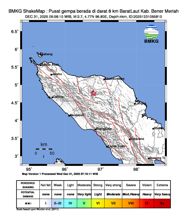 Pusat gempa berada di darat 8 km BaratLaut Kab. Bener Meriah