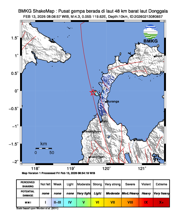 Pusat gempa berada di laut 48 km barat laut Donggala