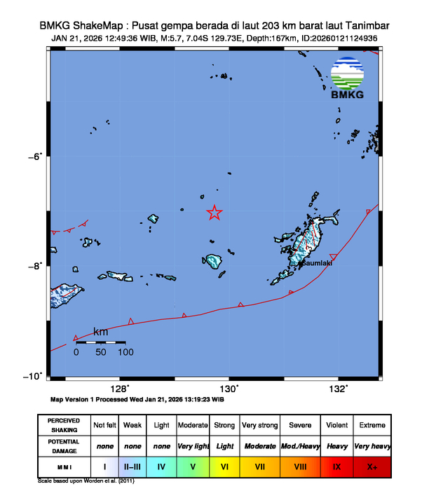 Pusat gempa berada di laut 203 km barat laut Tanimbar